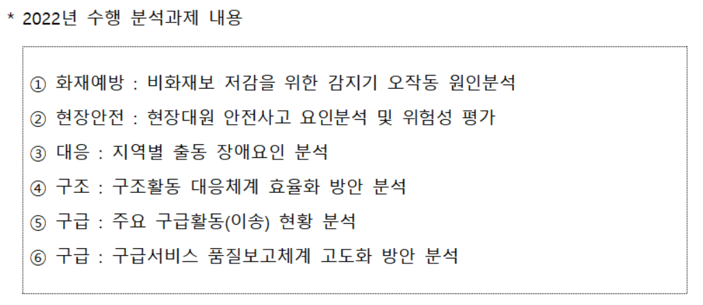 빅데이터 분석은 2020년 7월 14일 소방청 빅데이터 업무부서 신설 이후인 2021년부터 본격화됐으며, 이때부터 매년 전국 소방기관과 외부 산·학·연을 대상으로 수요조사를 실시하고, 1~2차에 걸친 전문가 심사과정을 통해 소방업무 주요 현안 과제를 최종 선정하고 있다.