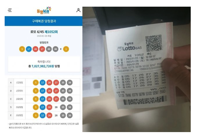 제1052회 로또복권에서 1등 3게임과 3등 2게임에 동시 당첨된 시민이 뒤늦은 당첨 후기를 전했다.