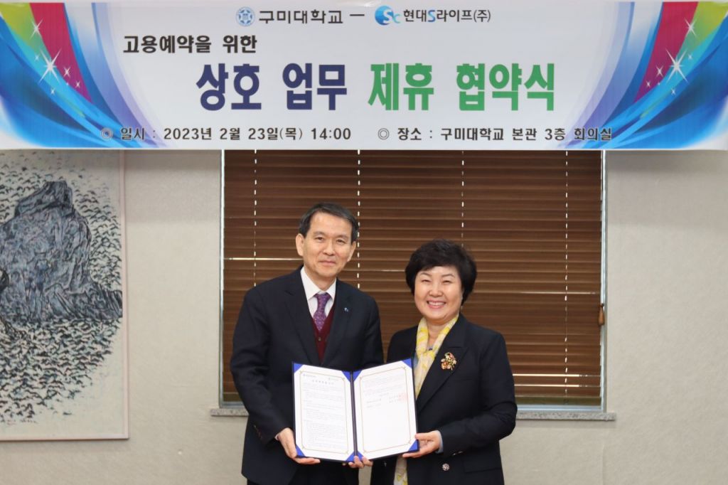홍진기 현대에스라이프 사장(사진 왼쪽)과 신혜경 구미대 대외협력실장이 고용예약 협약 인증서를 들어보이고 있다.