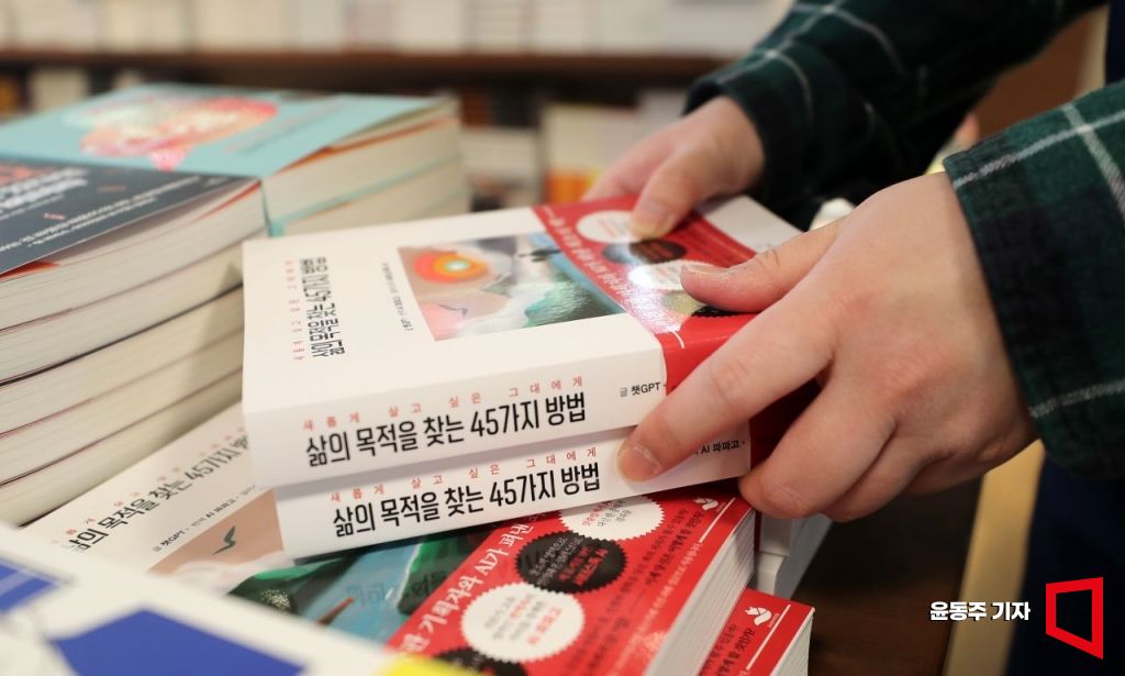 23일 서울 종로구 교보문고 자기개발서 코너에서 한 직원이 인공지능 챗GPT가 쓴 자기계발서 <삶의 목적을 찾는 45가지 방법>을 정리하고 있다. 사진=윤동주 기자 doso7@