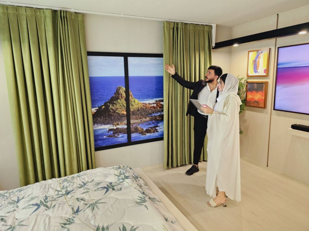 이라크 바그다드에 있는 '스마트싱스 홈' 스마트 침실존에서 관람객이 스마트싱스를 통해 전동 커튼을 조정하고 있다. / [사진제공=삼성전자]