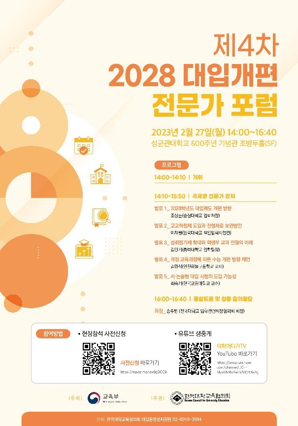 교육부와 한국대학교육협의회는 '제4차 2028 대입개편 전문가 토론회'를 개최한다.