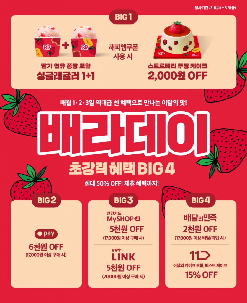 배스킨라빈스는 딸기 연유 퐁당 출시를 기념해 다음 달 1일부터 3일까지 이달의 맛을 가장 먼저, 가장 큰 혜택으로 즐길 수 있는 ‘배라데이’를 실시한다. 해피포인트 애플리케이션(해피앱) 이벤트 페이지에서 3월 이달의 맛 ‘싱글 레귤러 1+1’ 또는 ‘이달의 케이크 2000원 혜택’ 쿠폰을 지급한다.