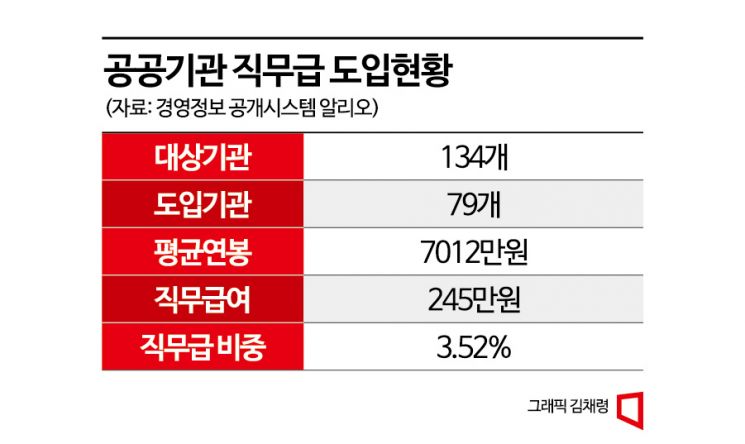 정부가 공공기관을 상대로 직무급제 확대 도입을 추진하는 가운데, 제도를 마련만 해놓고 유명무실하게 두는 기관이 허다한 것으로 파악됐다. 직무급이 수만원에 불과하거나 다른 업무 수당을 끌어다 쓰는 곳이 대부분이었다. 정부가 직무급 도입 기관을 늘리는 것에만 집중하면 노동개혁 효과를 보기 어렵다는 지적이 나온다.