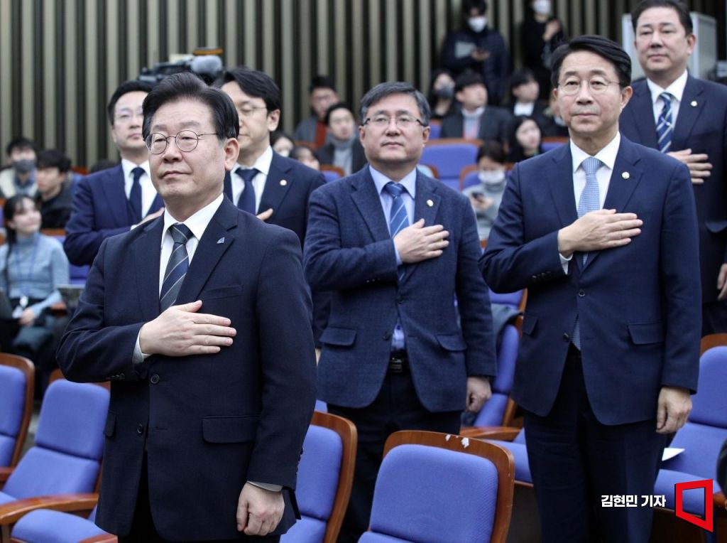 이재명 더불어민주당 대표가 21일 서울 여의도 국회에서 열린 의원총회에서 국기에 경례하고 있다. 민주당은 이번 의원총회에서 검찰의 구속영장 청구에 따른 이 대표 체포동의안 처리 문제를 논의한다. 사진=김현민 기자 kimhyun81@