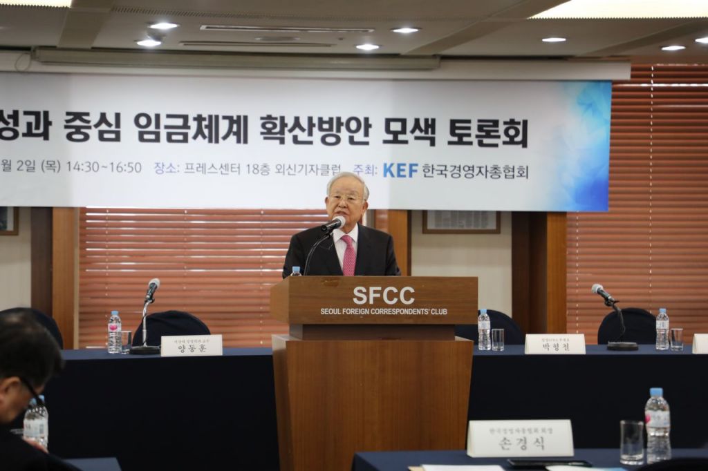 지난달 2일 열린 직무·성과중심 임금체계 확산 방안 모색 토론회에서 손경식 경총 회장이 인사말을 하고 있다.[사진=경총]