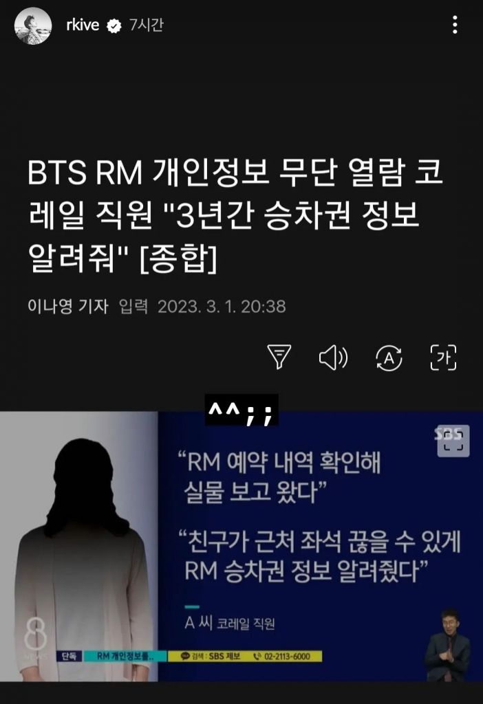 한국철도공사(코레일) 직원이 방탄소년단(BTS) 리더 RM의 승차 기록과 개인정보를 무단 열람한 사실이 발각된 가운데, RM이 불편한 심기를 드러냈다.