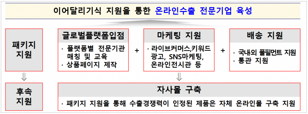 플랫폼 입점, 마케팅, 물류, 배송 등 온라인 수출 전 과정을 원스톱 패키지로 지원한다. 세부 지원사업으로는 ▲글로벌 쇼핑몰 입점판매 ▲온라인 전시회 ▲미디어 콘텐츠 마케팅 ▲온라인수출 공동물류 등이 있다.