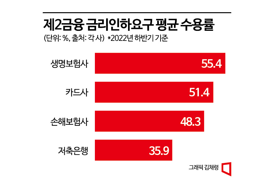한편 카드사와 보험사의 평균 수용률도 40~50%대에 그쳤다. 총 18만5900건이 신청됐고 9만6236건이 수용됐다. 총감면액은 40억원 수준이었다. 업권별로는 생명보험사의 수용률이 55.4%로 가장 높았다. 이어 카드사(51.4%), 손해보험사(48.3%)의 순서였다. 다만 금리인하요구권 수용으로 감면된 이자액 규모는 카드사가 28억9000만원으로 가장 컸다. 생명보험사와 손해보험사는 각각 7억8000만원, 3억3000만원씩 이자를 감면했다.