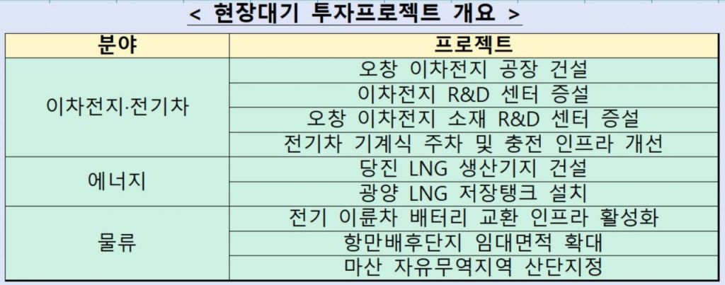 정부는 이차전지·전기차, 에너지, 물류 등을 중심으로 9건의 현장대기 투자 프로젝트의 애로를 해소했다.