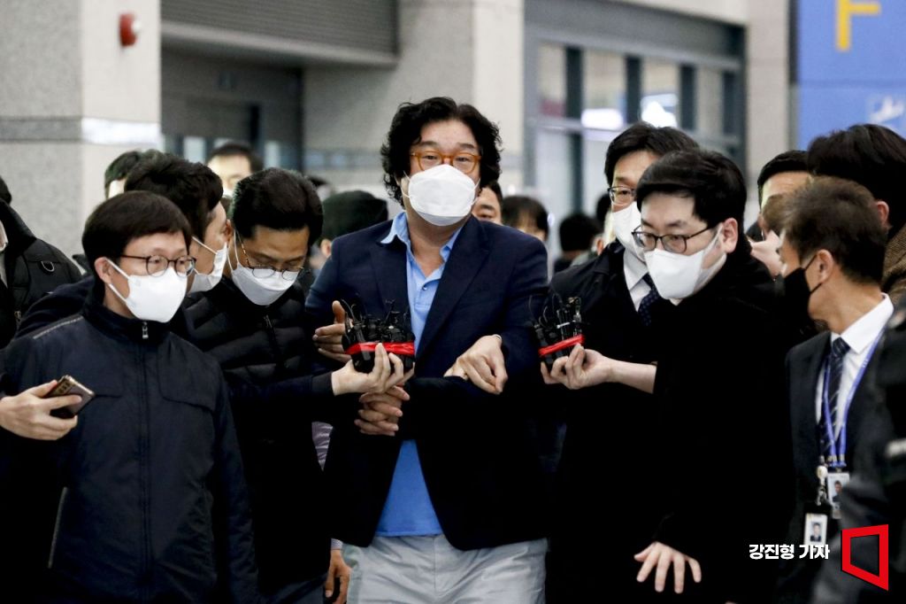 해외 도피 중 태국에서 붙잡힌 김성태 쌍방울 그룹 전 회장이 지난 1월17일 인천국제공항 제1여객터미널을 통해 귀국하고 있다. 사진=강진형 기자aymsdream@