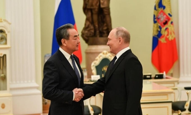 지난달 22일 블라디미르 푸틴 러시아 대통령(오른쪽)이 크레믈궁을 방문한 왕이 중국 공산당 중앙정치국 위원과 악수하고 있다. [이미지출처=AP연합뉴스]