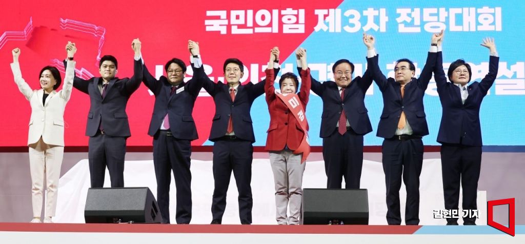 2일 경기 고양시 고양체육관에서 열린 국민의힘 제3차 전당대회 서울·인천·경기 합동 연설회에서 최고위원 후보들이 손을 맞잡고 당원들에게 인사하고 있다. / 사진=김현민 기자 kimhyun81@