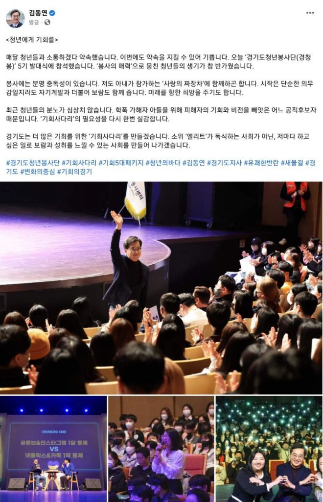 김 지사는 4일 자신의 사회적 관계망(SNS)에 올린 글을 통해 "매달 청년들과 소통하겠다고 약속했는데 이번에도 약속을 지킬 수 있어 기쁘다"며 "오늘 '경기도청년봉사단(경청봉)' 5기 발대식에 참석했다"고 전했다.