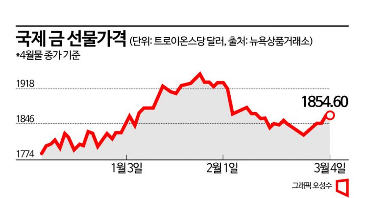 6일 뉴욕상품거래소(COMEX)에 따르면 4월물 금 선물 가격은 트라이온스당 1860.25달러(약 240만원)에 거래되고 있다. 전날에는 1854.60달러에 장을 마쳤다. 지난해 초 2000달러에 육박했던 국제 금 선물가격은 미 연방준비제도(Fed)의 강도 높은 긴축으로 달러화가 강세를 보이면서 줄곧 내리막길을 걸었다. 금은 달러화로 표시되는 자산으로, 금값과 달러는 역의 상관관계를 가진다. 달러가 약세를 보이면 경쟁적 관계인 금 가격이 오르는 식이다.