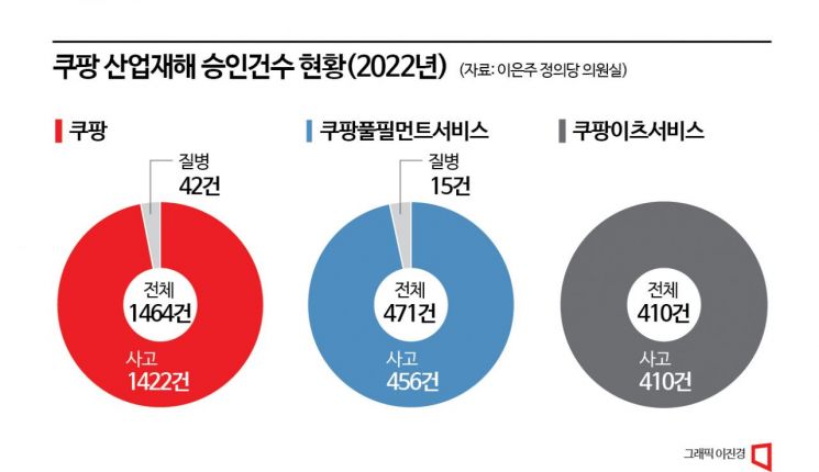 코로나19 사태 이후 물류량이 급증하면서 쿠팡의 산재도 폭증했다. 쿠팡에서는 2018년 193건, 2019년 334건, 2020년 758건, 2021년 1957건의 산재가 승인됐다. 쿠팡풀필먼트서비스는 2018년 148건, 2019년 181건, 2020년 224건, 2021년 297건을 기록했다. 쿠팡은 직원 수 대비 산재 신청 비율이 다른 기업들에 비해 낮다는 입장이다. 쿠팡 관계자는 "직원들의 업무 효율을 높이고 근무강도를 낮추기 위해 기술 및 물류 인프라에 지난해에만 7500억원을 투자했다"고 설명했다.
