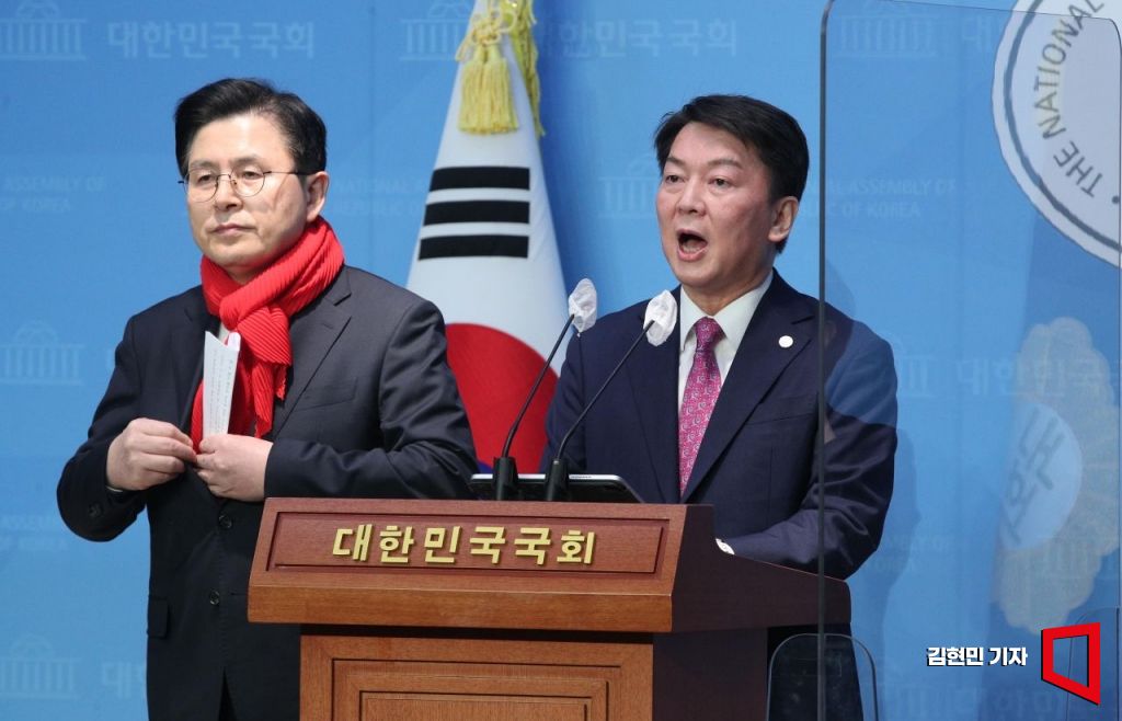국민의힘 전당대회를 하루 앞둔 7일 안철수·황교안 후보는 공동 기자회견을 열고 김기현 후보의 사퇴를 촉구했다. 이에 김 후보 측은 "정치적 이해관계가 만들어낸 촌극"이라는 입장을 밝혔다.