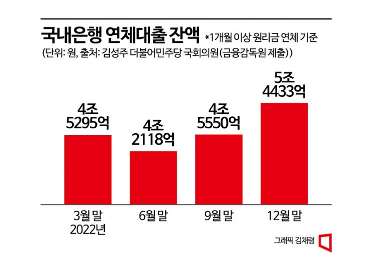 국내은행의 연체대출 잔액이 3개월 사이에 1조원 가량 증가한 것으로 드러났다. 지난해 하반기 대출금리가 급격하게 오르면서 취약차주들을 중심으로 원리금 연체 사례가 늘어난 것으로 보인다.