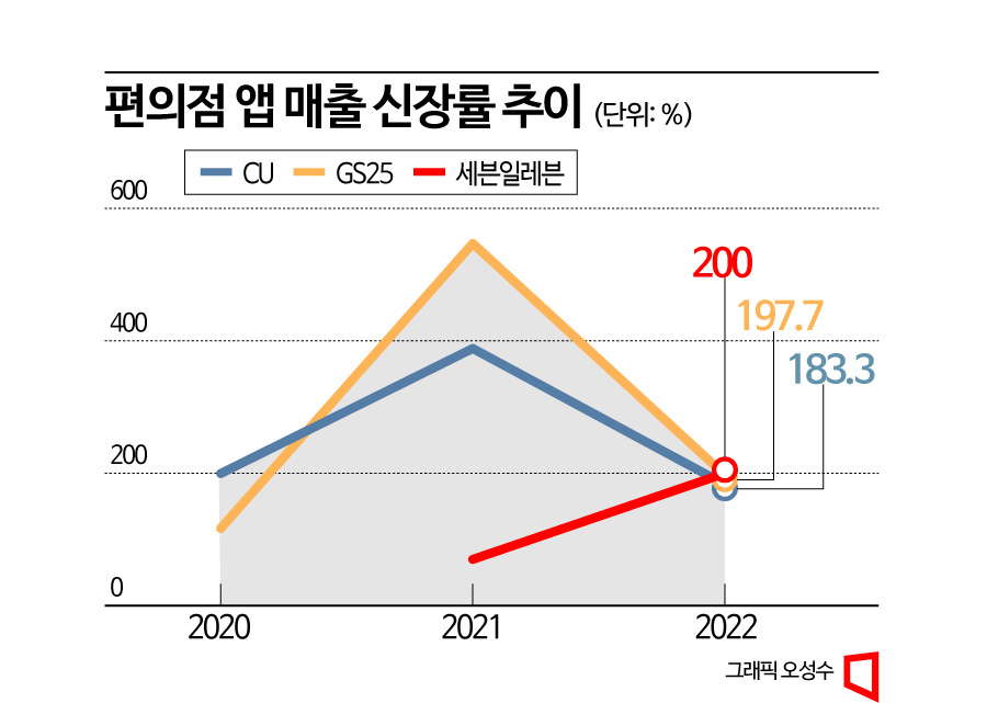 GS25도 지난해 GS리테일의 통합 앱 ‘우리동네GS’의 매출이 1년 전보다 197.7% 늘었다. 2021년 500% 이상 고성장에도 멈추지 않는 성장세를 보여준 셈이다. 올해 1~2월에도 전년 대비 142.3% 늘어난 앱 매출을 기록하고 있다. 세븐일레븐 역시 앱 판매 매출이 2021년 70%에 이어 지난해 200%의 높은 증가율을 거뒀다.