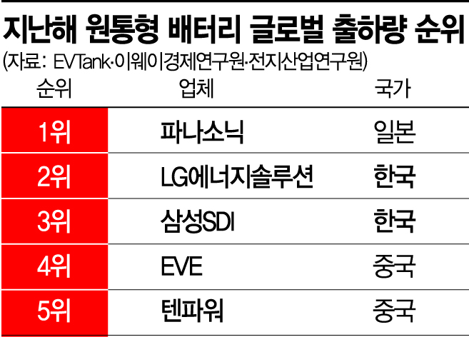 원통형 배터리는 일상에서 흔히 쓰는, 전통적인 모양의 배터리다. 하지만 지금까지 전기차엔 주로 각형과 파우치형 배터리가 들어갔다. 원형 배터리를 여러개 넣으면 사이사이 빈 공간이 생길 수밖에 없기 때문이었다. 배터리의 에너지 밀도와 공간활용을 위해 공간에 꽉꽉 채워 넣을 수 있는 각형, 파우치형 배터리를 사용해 온 것이다. 그간 원통형 배터리 시장 최대 강자는 일본 파나소닉이었다.