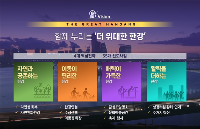시는 이를 위해 '함께 누리는 더 위대한 한강'을 비전으로 삼아 4대 핵심전략 ▲자연과 공존하는 한강 ▲이동이 편리한 한강 ▲매력이 가득한 한강 ▲활력을 더하는 한강을 발표했다.