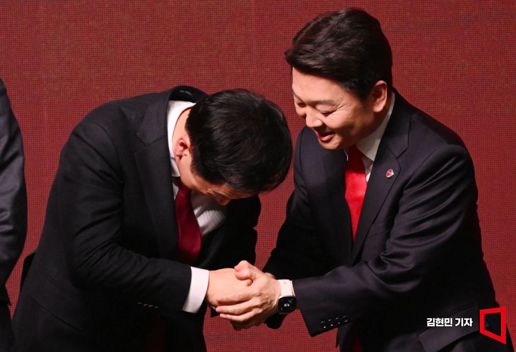 국민의힘 당대표로 선출된 김기현 의원이 8일 경기 고양시 킨텍스에서 열린 제3차 전당대회에서 안철수 의원과 악수하고 있다. 사진=김현민 기자 kimhyun81@