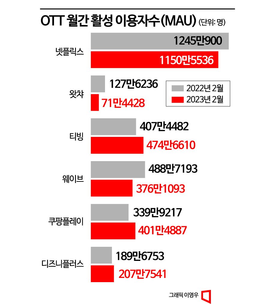 이와 반대로 웨이브 이용자수는 1년 만에 100만명 넘게 급감했다. 지난해 2월 488만7193명이었던 이용자수는 지난달 376만1093명을 기록했다. 토종 OTT 1위였던 웨이브는 지난해 9월 티빙에게 1위 자리를 내줬다.