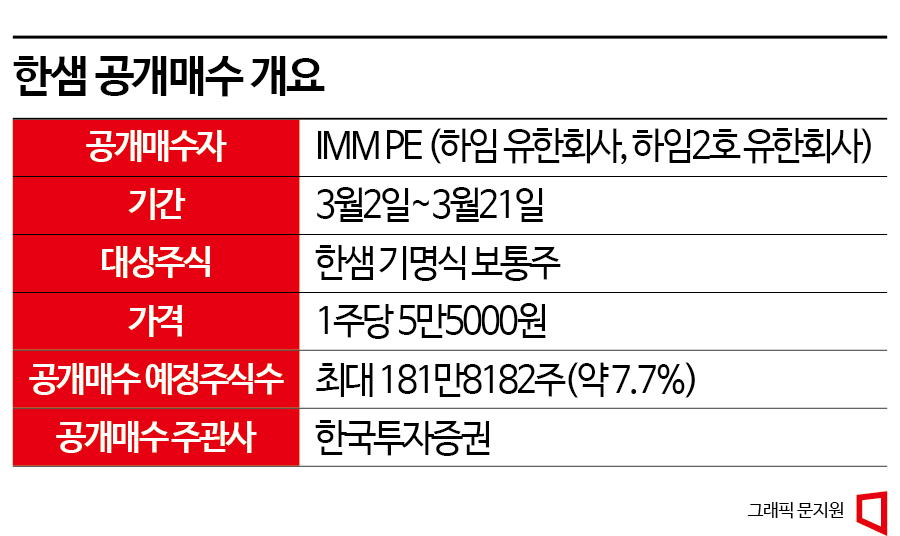 앞서 IMM PE는 이달 2일부터 21일까지 20일 동안 한샘 주식 181만8182주(7.7%)를 주당 5만5000원에 공개매수한다고 밝혔다. 이번 공개매수는 IMM PE가 한샘 인수를 위해 설립한 하임 유한회사와 하임2호 유한회사를 통해 각각 103만 8182주, 78만주를 인수하는 방식으로 진행한다.