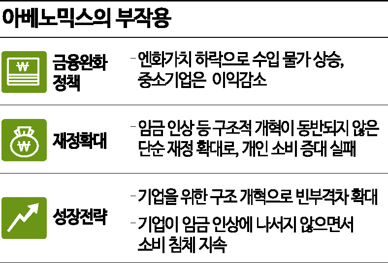 그러나 연간 경제성장률은 연율 기준 여전히 1%대 저성장을 벗어나지 못했다. 지난해 4분기의 경우 일본의 GDP 성장률은 시장 전망치(2.0%)를 크게 밑도는 0.1%를 기록했다. 특히 내수시장을 떠받치는 민간 소비가 전기 대비 0.3% 늘어나는 데 그치며 전체 경제 성장률을 끌어내렸다. 결국 대대적인 돈풀기에도 일본 경제는 제로(0) 성장을 기록하며 아베노믹스는 실패로 돌아갔다.
