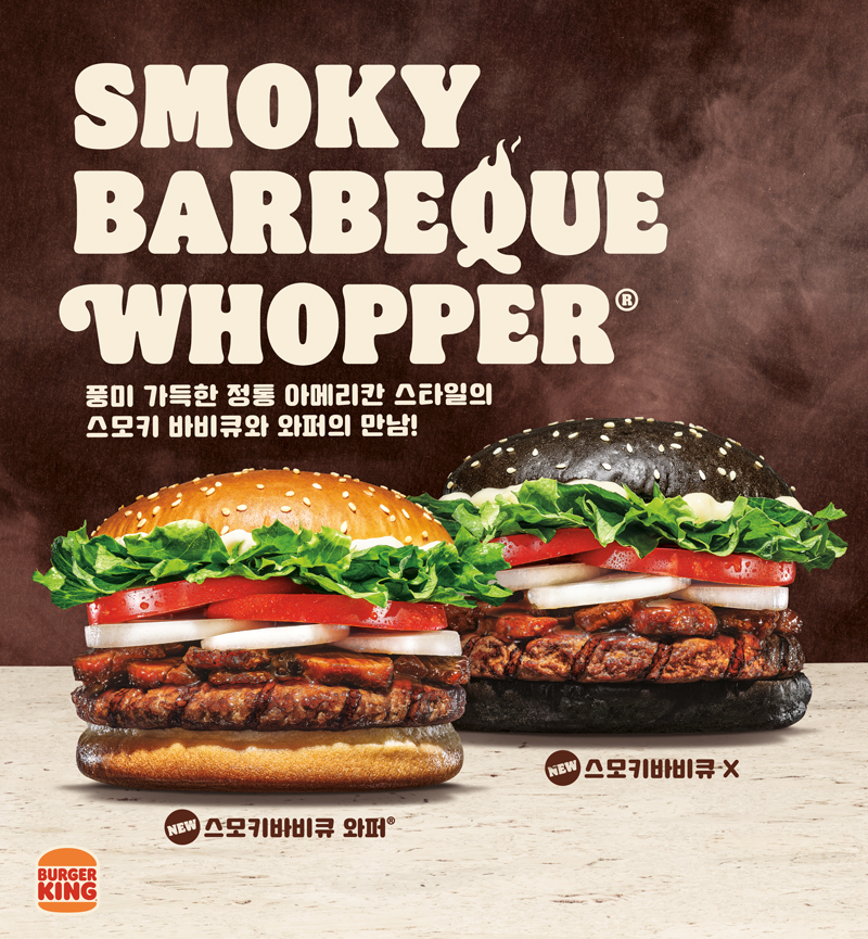신제품은 직화로 구워 불맛 가득한 100% 순 쇠고기 패티에 스모크 하우스에서 천천히 익혀 훈연향이 가득한 스모키 바비큐를 더했다. 특히 토마토 소스 베이스에 다양한 허브를 넣은 특제 소스가 달콤함과 깔끔함을 더한다. 천천히 조리해 더 맛있는 스모키 바비큐처럼 일반 번보다 발효 시간이 긴 ‘블랙와퍼번’을 사용해 더욱 부드럽고 쫄깃한 식감과 더욱 두툼한 패티로 즐길 수 있는 ‘스모키바비큐X’로도 선보인다.