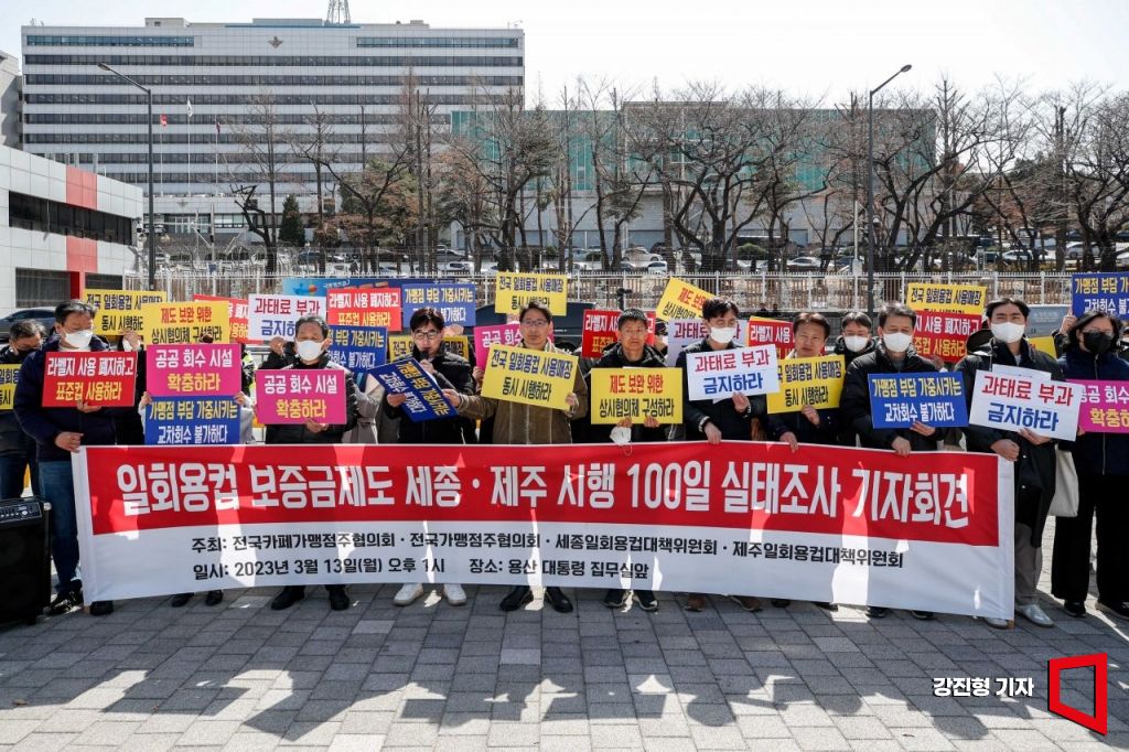 전국가맹점주협의회, 전국카페가맹점주협의회 등 4개 단체는 13일 오후 서울 용산구 대통령 집무실 앞에서 ‘세종·제주 일회용컵 보증금 시범사업 시행 100일 실태조사 기자회견’을 열고 이같이 밝혔다.