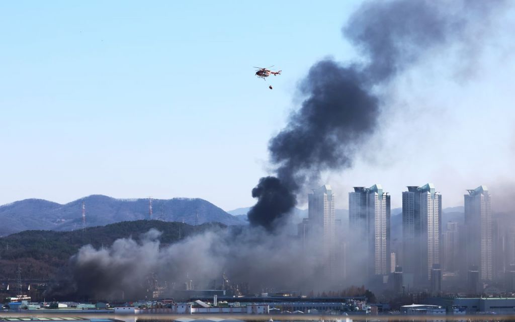 13일 오전 대전시 대덕구 목상동 한국타이어 공장에서 난 불로 인한 연기가 공중으로 치솟고 있다. 소방헬기가 연신 물을 뿌리며 진화작업을 펼치고 있다. [사진=연합뉴스]