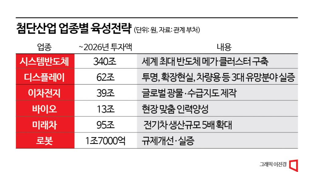 디스플레이와 함께 이차전지, 바이오, 미래차, 로봇도 첨단산업으로 육성한다. 우선 이차전지는 2030년까지 세계 1위 도약을 목표로 내걸었다. 경쟁 상대는 중국이다. 2026년까지 5년간 39조원을 투자한다. 2025년까지 국내 이차전지 생산용량을 60GWh 이상 확보할 계획이다. 2021년의 1.5배 규모로 키운다는 뜻이다. 장기·저리 대출, 보증 등에 올해 정책금융 5조3000억원을 투입한다. 동시에 2000억원 규모 민간펀드를 조성해 강소기업을 키운다. 핵심 광물을 안정적으로 확보하기 위해 글로벌 광물 수급지도 개발한다.