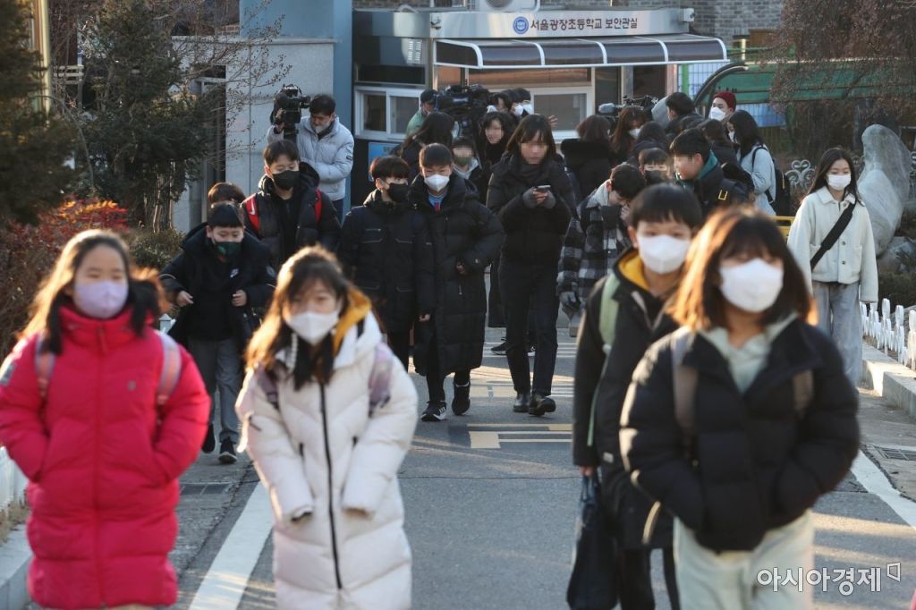 실내에서의 마스크 착용이 법정 의무에서 착용 권고로 전환된 지난 1월 30일 서울 광진구 광장초등학교 학생들 대부분이 마스크를 쓰고 등교하고 있다. 사진=허영한 기자 younghan@