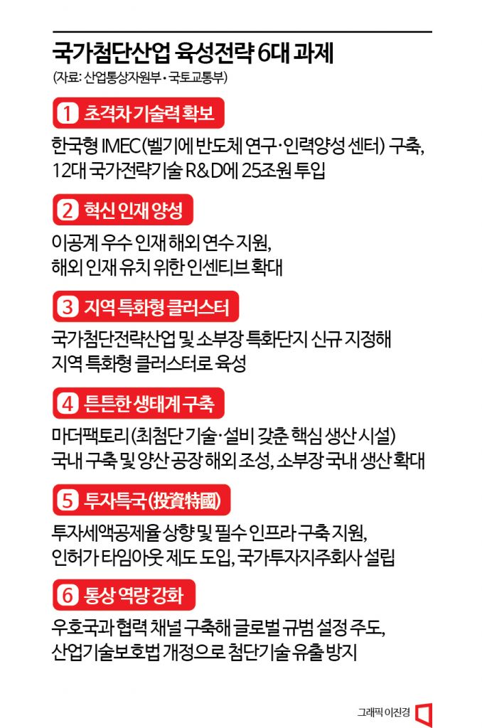 산업부는 이를 위해 국가첨단산업 육성 전략 핵심 과제를 발표했다. 구체적으로 ▲초격차 기술력 확보 ▲혁신 인재 양성 ▲지역 특화형 클러스터 ▲튼튼한 생태계 구축 ▲투자특국(投資特國) ▲통상 역량 강화 등 여섯 가지다.