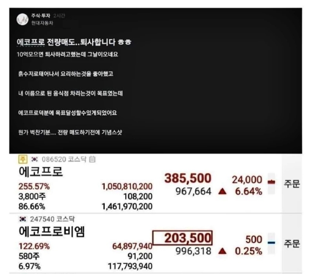 그는 "흙수저로 태어나서 요리하는 것을 좋아했다. 내 이름으로 된 음식점 차리는 것이 목표였는데 에코프로 덕분에 목표를 달성할 수 있게 됐다"면서 "뭔가 벅찬 기분이다. 전량 매도하기 전에 기념으로 인증샷 남긴다"고 적었다.