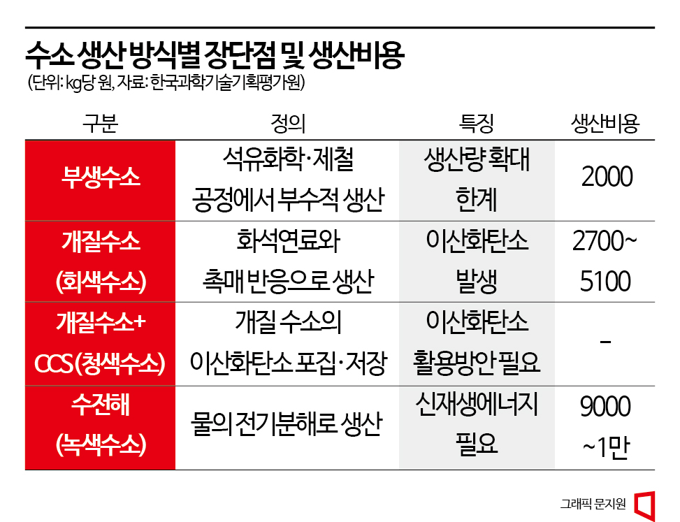 수소 생산비용은 현재 생산 방식에 따라 천차만별이다. 가장 저렴한 수소는 석유화학이나 제철 공정에서 배출되는 부생수소로, kg당 2000원을 넘지 않는다. 하지만 대량 생산이 불가능하다. 말 그대로 유화 제품이나 철강을 생산하는 과정에서 부수적으로 나온다. 생산량을 늘리려면 막대한 투자가 필요하다.
