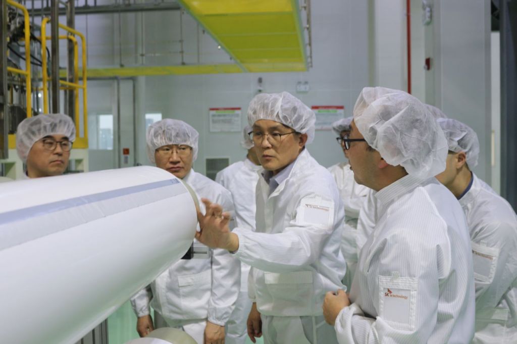 김철중 SKIET 사장(가운데)이 지난 14일 중국 창저우시 SK아이이테크놀로지 중국 생산공장을 방문해 관계자들과 생산 시설을 둘러 보고 있다. [사진제공=SKIET]