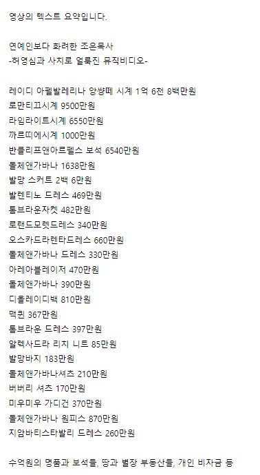 원글을 작성한 카페 회원 A씨는 "지난해 말에 정조은의 비리를 폭로하다가 지금은 사라진 익명 유튜버가 있다. 정조은의 거액의 차명 자산, 명품, 비자금 등에 대한 증거와 함께 의혹을 제기해 카페에서도 관심이 높았었다. 가장 직관적으로 와닿았던 명품 관련 사진들을 캡처해뒀다"면서 정조은이 그간 착용한 제품을 공개했다.