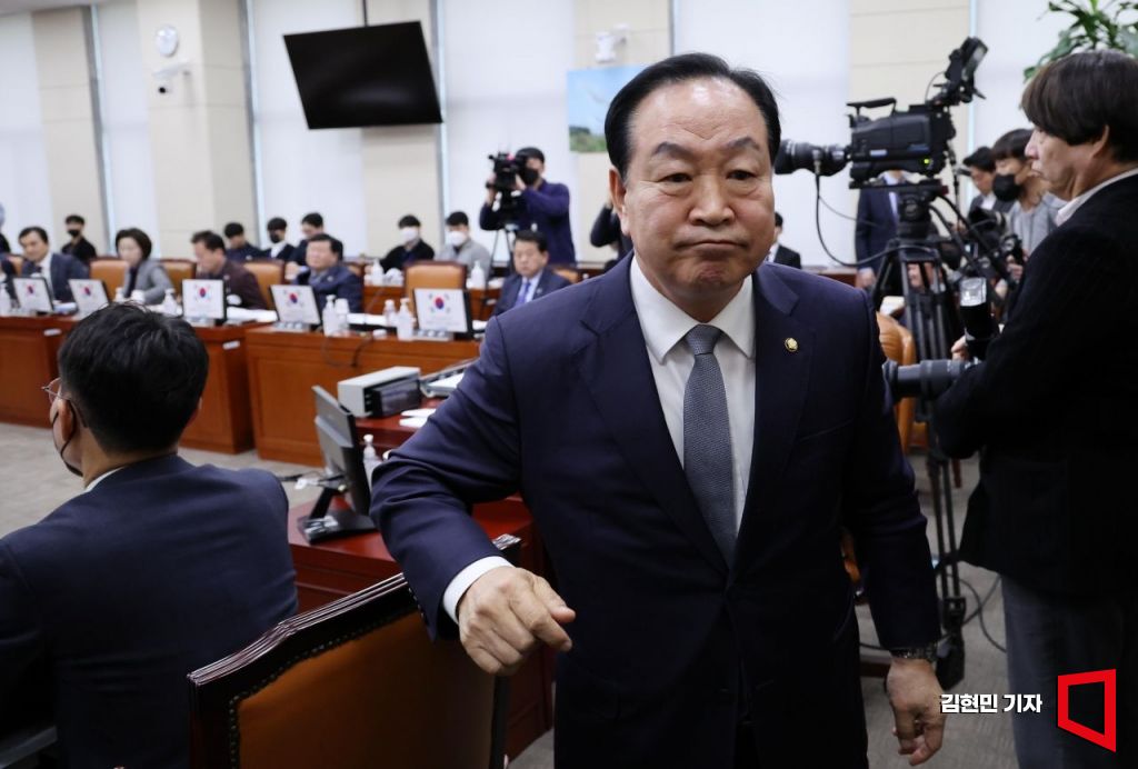 한기호 국회 국방위원장이 17일 서울 여의도 국회 국방위원회 전체회의실에서 더불어민주당 위원들에게 의원석에 게시된 피켓을 떼 달라고 요청하다 받아들여지지 않자 회의장을 나서고 있다. 사진=김현민 기자 kimhyun81@