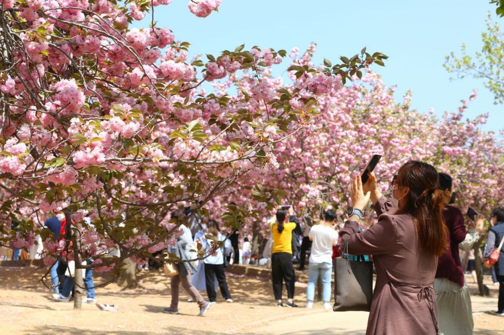 지난해 열린 경주 불국사 겹벚꽃 축제에서 관람객들이 벚나무를 배경으로 사진을 찍고 있다.[사진제공=경주시]