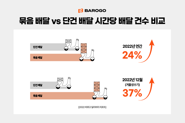 단건으로만 배달한 라이더보다 '묶음 배달'을 수행한 라이더의 동선 효율성(라이더의 시간당 배달 건수)이 24%가량 높았다. 이 차이는 배달 극성수기인 겨울에 약 37%로 더 크게 벌어졌다.