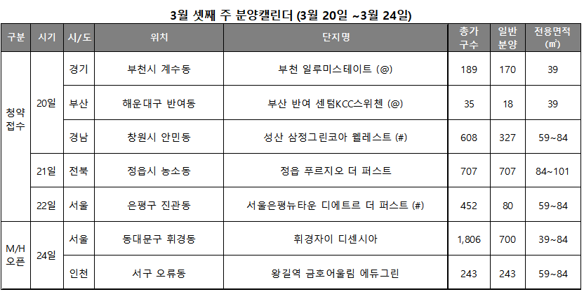 이 외에도 경남 창원시 성산 삼정그린코아 웰레스트(공공지원 민간임대, 327가구), 경기 부천시 부천 일루미스테이트(170가구), 부산 해운대구 부산 반여 센텀KCC스위첸(18가구)가 청약 접수를 받는다.