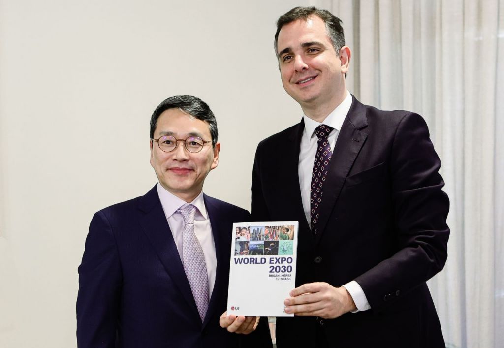 조주완 LG전자 사장(왼쪽)과 호드리구 파셰쿠 브라질 상원의장이 2030 부산세계박람회 논의 만남을 기념해 사진을 촬영하고 있다. / [사진제공=LG전자]
