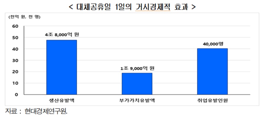 생산·부가가치·취업 유발계수를 이용해 대체공휴일 1일의 경제적 효과를 산출한 결과 생산유발액은 약 4조8000억원에 달한다. 또 부가가치유발액은 약 1조9000억원, 취업유발인원은 약 4만명으로 추산했다.