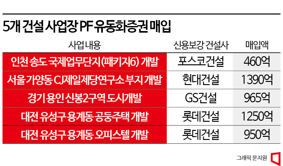 유동화증권 매입 대상이 된 사업장은 포스코건설이 시공권을 보유한 ‘인천 송도국제업무단지 패키지6 개발’, 현대건설이 공사를 맡은 ‘서울 가양구 CJ제일제당연구소 부지 개발’, GS건설이 보증한 용인시 신봉2구역 도시 개발‘, 롯데건설이 보증한 대전시 유성구 용계동 공동주택 및 오피스텔 개발’ 등의 사업이다.