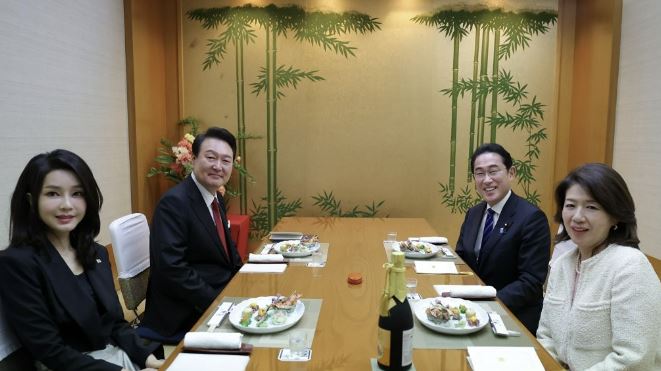 1박2일 일정으로 일본을 방문한 윤석열 대통령과 김건희 여사가 기시다 후미오 일본 총리 부부와 지난 16일 도쿄 긴자의 한 스키야키·샤부샤부 전문점에서 만찬을 하고 있다.[이미지출처=연합뉴스]