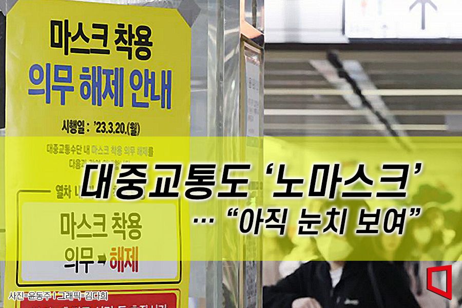 "문이 열립니다." 20일 오전 7시, 출근길에 나선 한모씨(30)는 서울 지하철 1호선 동묘앞역에서 마스크를 손에 든 채 문이 열리는 객차 안을 들여다봤다. 마스크를 쓰고 대중교통을 탈 때마다 호흡 곤란, 식은땀, 어지러움 등 답답함이 심해 공황장애 증상까지 겪었던 한씨는 얼마나 많은 사람이 마스크를 벗고 있는지 궁금했다. 하지만 지하철 안은 여전히 마스크를 쓴 사람들로 가득했다. 눈치가 보였던 한씨는 코만 내놓았을 뿐, 완전히 마스크를 벗지 못하고 출근길에 올랐다. 한씨는 "마스크 의무 해제 첫날이라 그런지 대부분이 마스크를 쓰고 있었다"며 "코라도 내놓고 있을 수 있어 그나마 나았다"고 말했다.