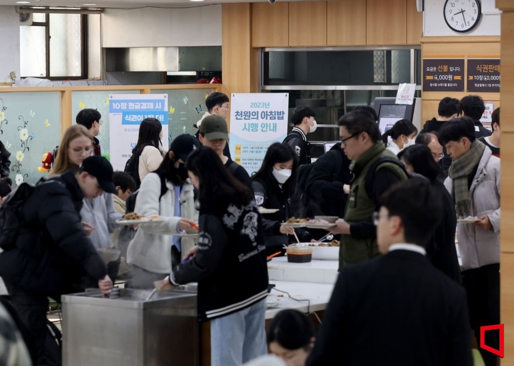 고려대학교 학생식당에서 재학생들에게 아침식사를 천 원에 제공하는 '천원의 아침밥' 제도를 20일 부터 시행한다. 이 제도는 코로나 기간 동안 중단되었었다. 사진=허영한 기자 younghan@