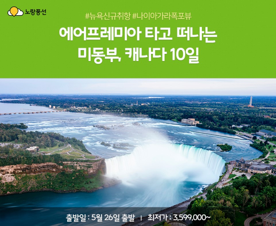 노랑풍선은 신규 상품 출시를 기념해 오는 31일까지 예약한 고객에 한해 객실에서 나이아가라 폭포의 절경을 만끽할 수 있는 특급호텔 1박, 천섬유람선 탑승, 스카이론타워 전망대 입장, 와인 1병과 초콜릿을 제공하는 다양한 특전도 준비했다.